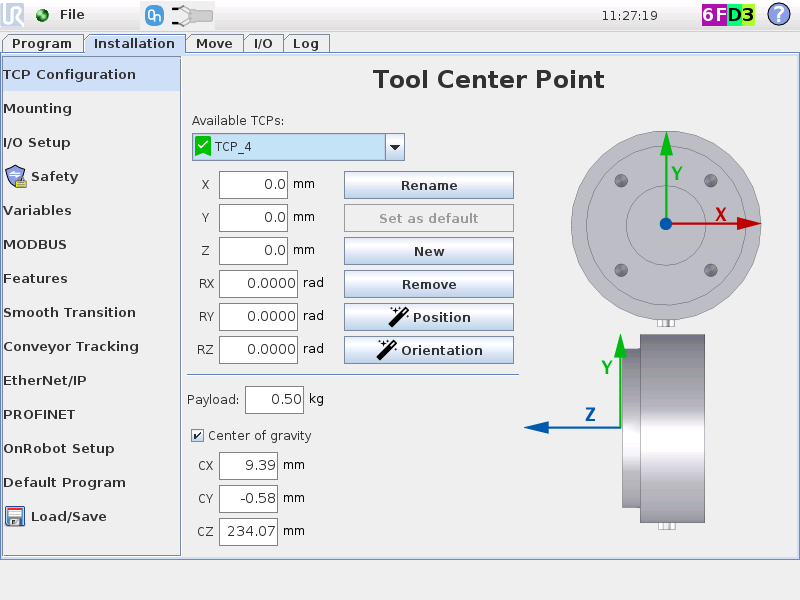 After that, we set the robot to use a TCP located in its flange. And with a tool orientation there Z+ upwards. After this, it is RoboDK that controls TCP